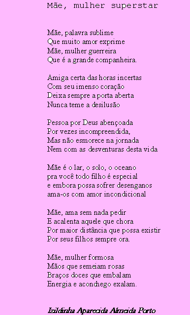 Para homenagear as mães, presenteamos com um poema escrito por uma mãe anapolina, Profa.Izildinha Aparecida Almeida Porto, que, como tantas mães, luta incansavelmente para ser além de mulher, esposa e excelente profissional, a melhor mãe do mundo.